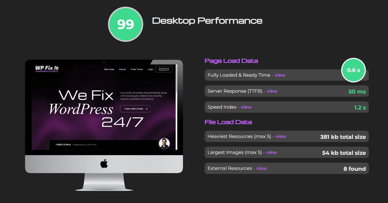 Get a free WordPress speed audit to see how fast your website loads on both desktop and mobile. Our quick and comprehensive check analyzes key performance metrics like load time, page size, and server response to help identify what’s slowing your site down.